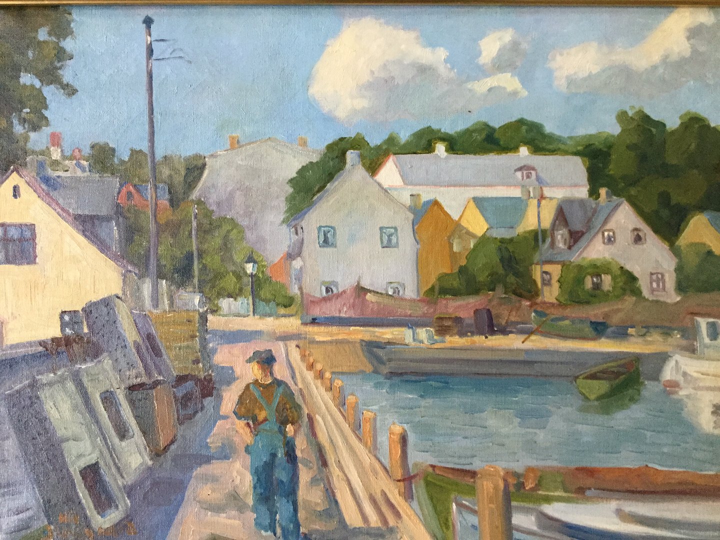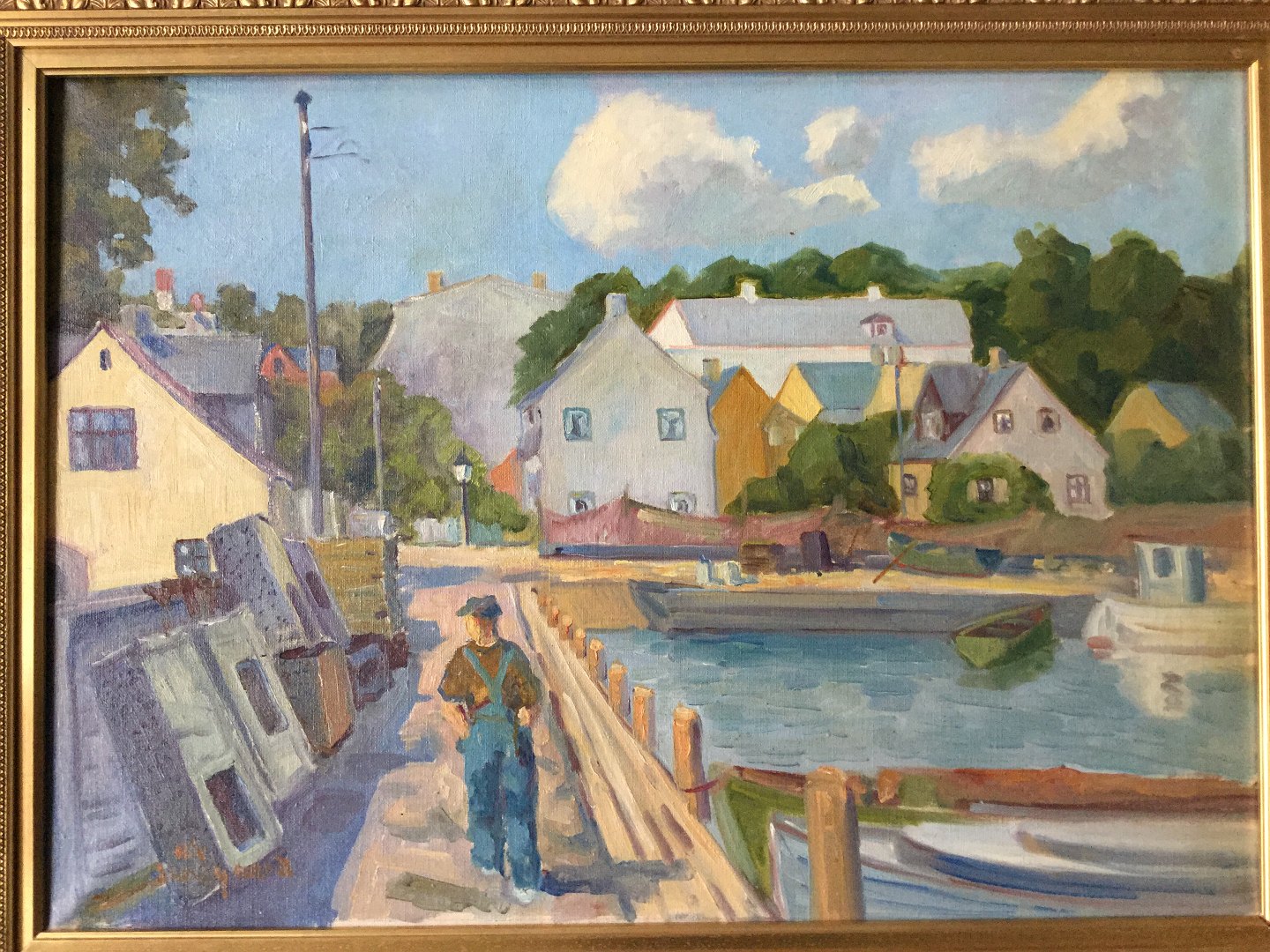 Maleri af Nis Stougaard - Havneparti, Bornholm.