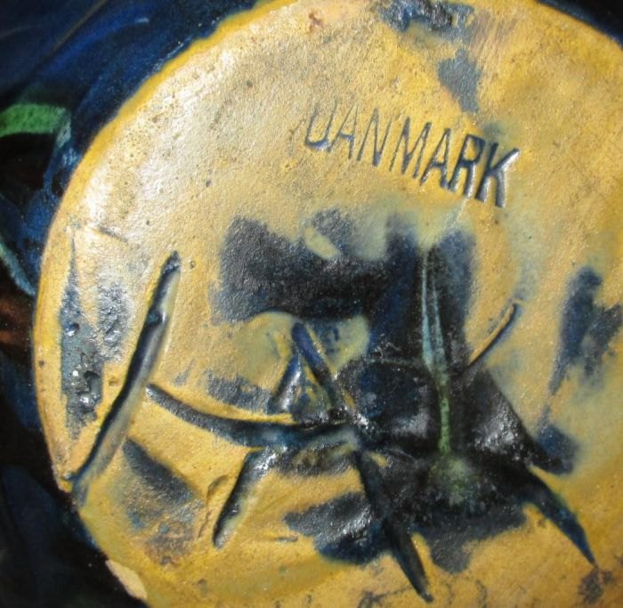 Decorated with flowers. With blue, black, brown and green overglaze. Height: 19 cm. Signed: HAK, Denmark.