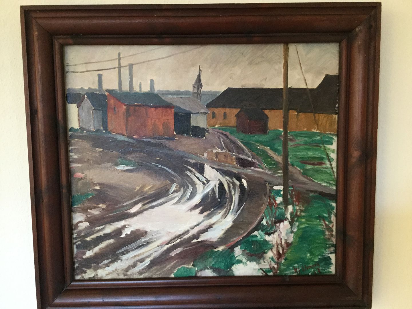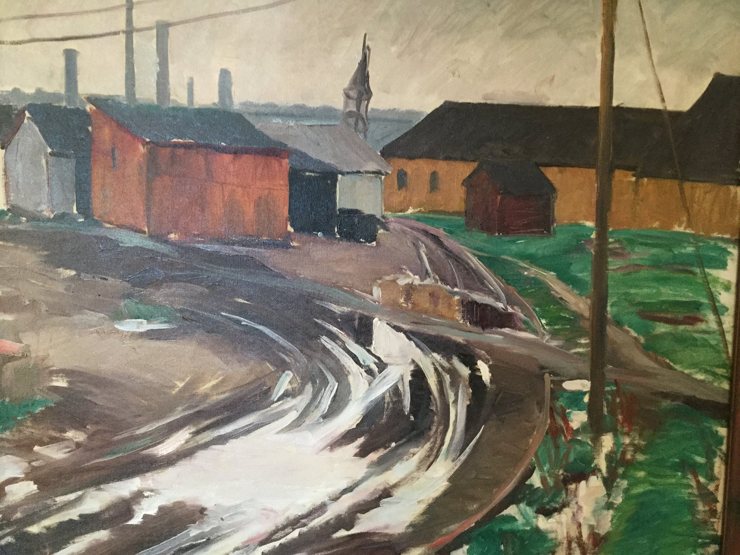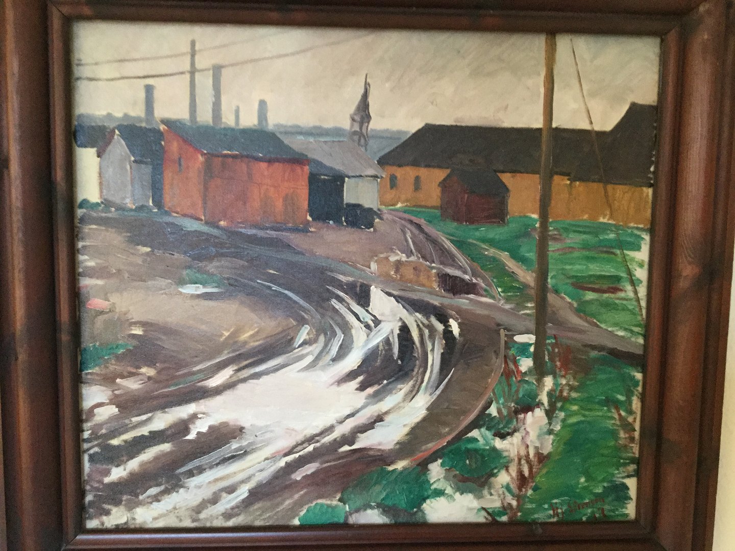 Maleri af Hjalmar Sørensen 1917 - Vej ved havn med gamle pakhuse.
