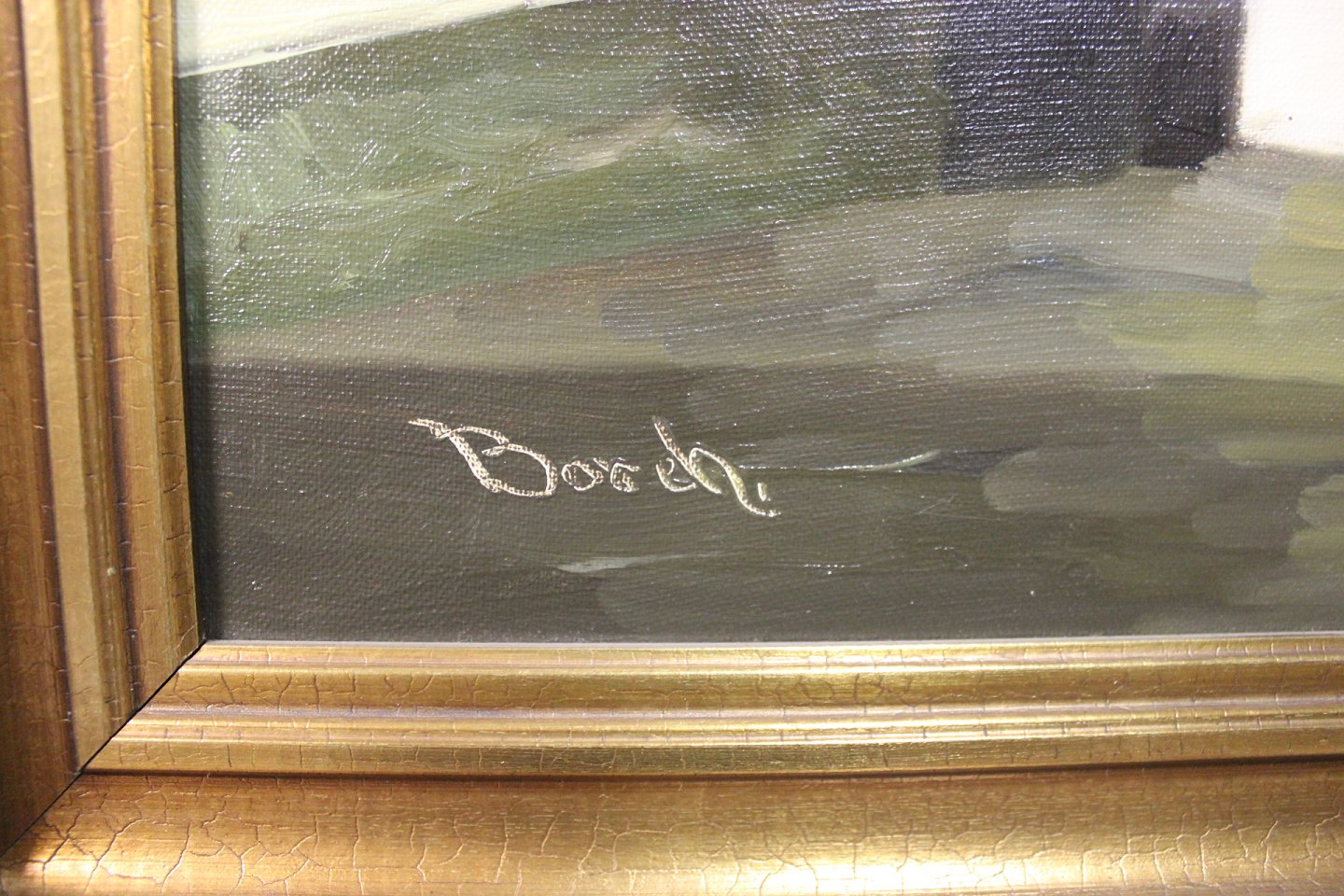Oliemaleri af simpelt rum signeret Borch med træramme dekoreret med guldblad.