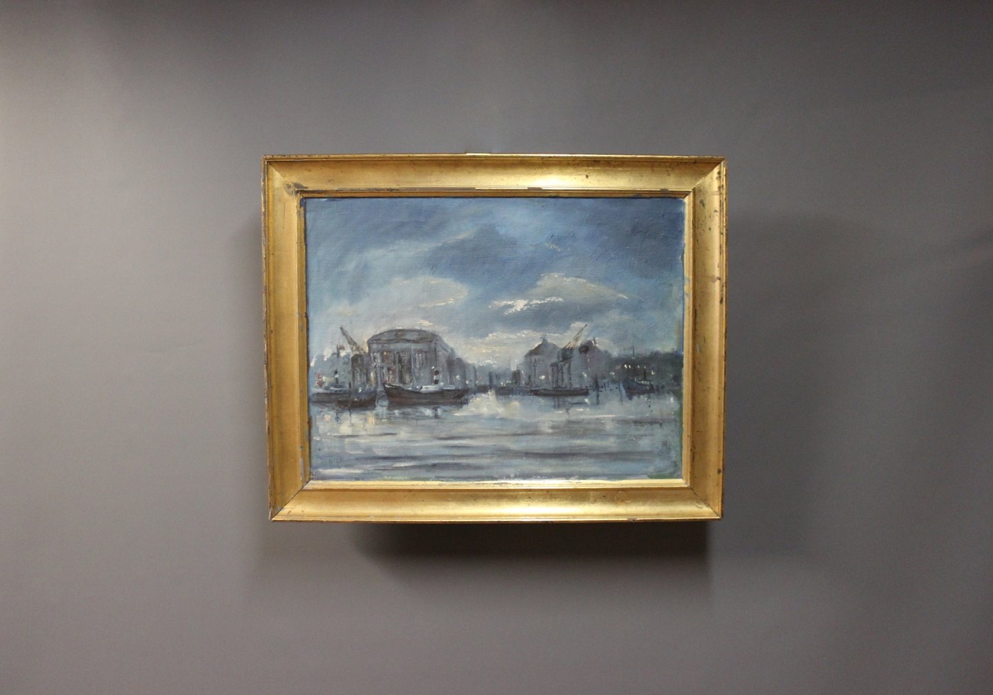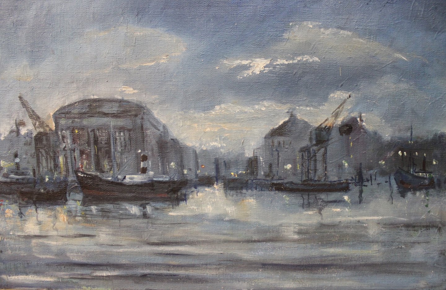 Oliemaleri af havnemiljø i mørke farver af Lis Bjergsted.
