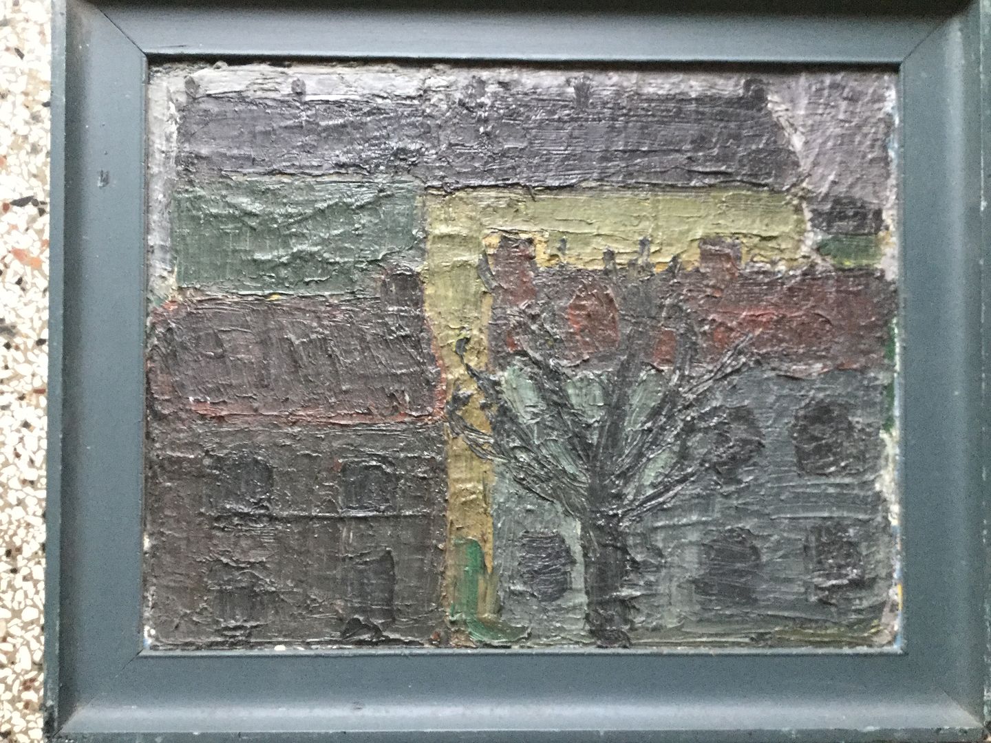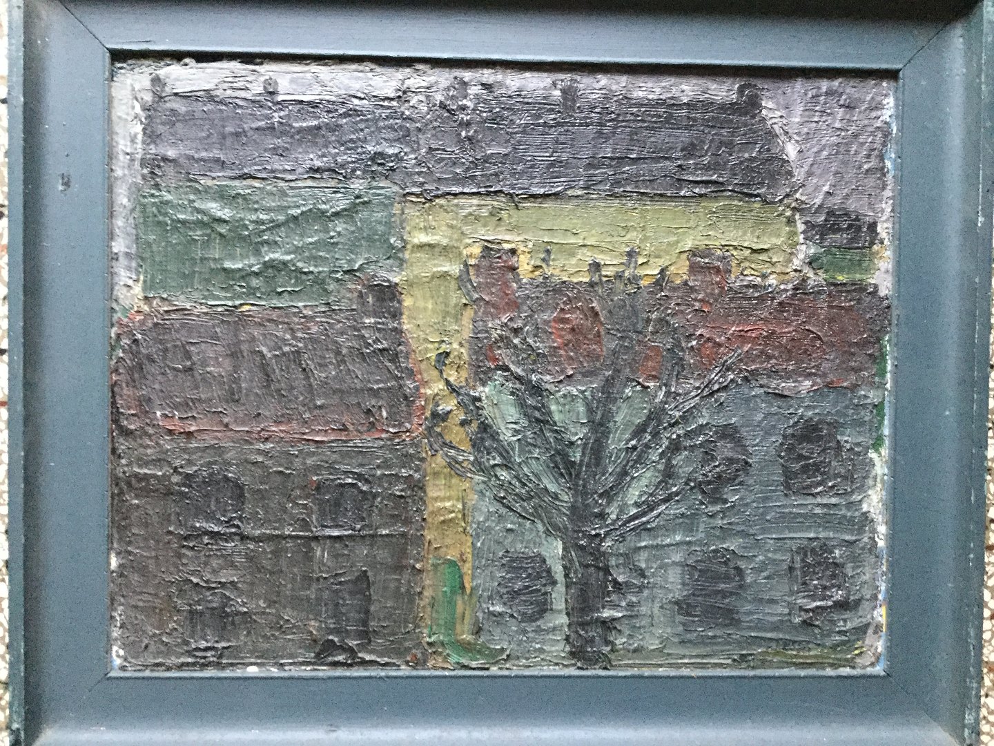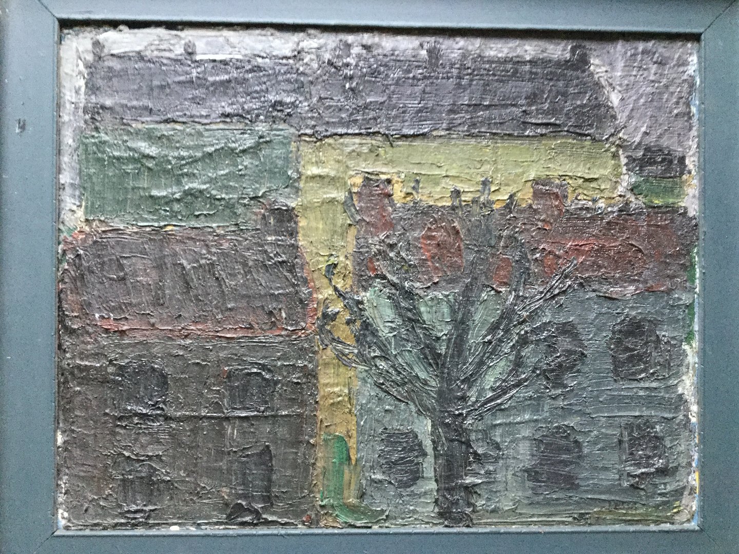 Maleri af Peder Brøndum Sørensen - Landskab med højhuse og nøgne træer 1958.