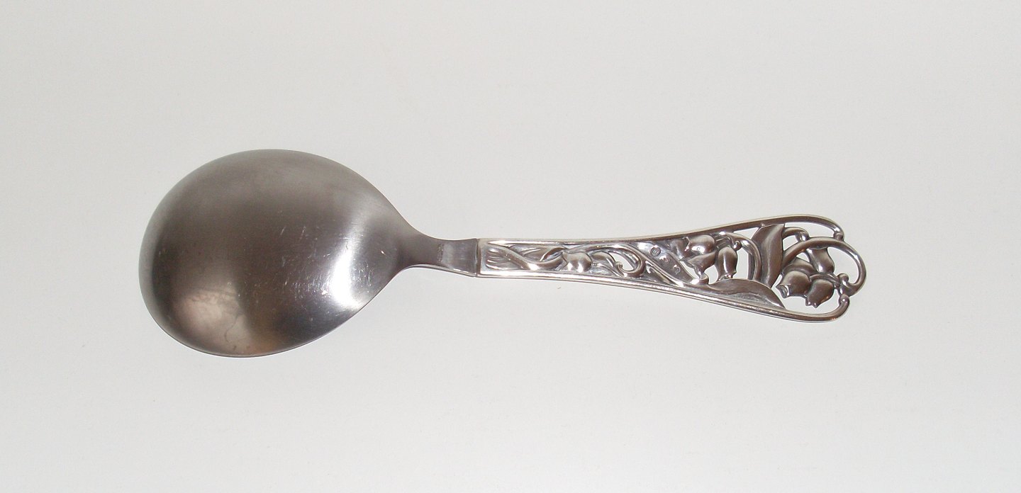 Serverings ske i sølv og stål dekoreret med liljekonval.