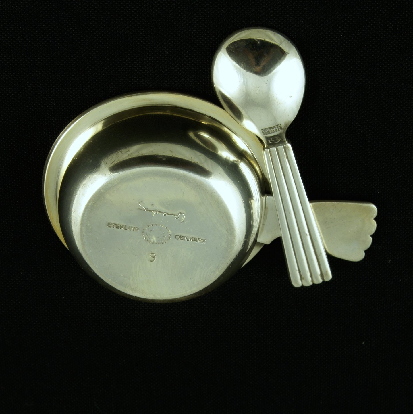 Georg Jensen. Saltkar med grøn emalje og tilhørende ske i sterling sølv #9 - Bernadotte
