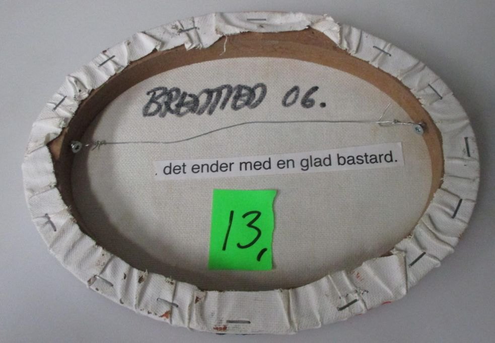 Bredtved, Michael (1959 - ) Danmark: Det ender med en glad bastard. Olie på lærred. Oval. 24 x 18 cm. Signeret: Bredtved 06.