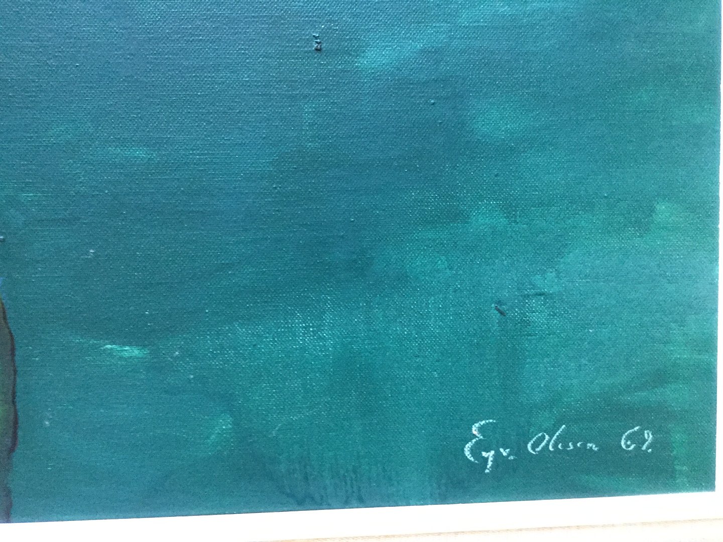 Maleri af Eyvind Olesen - Kystparti med ejendom 1967.