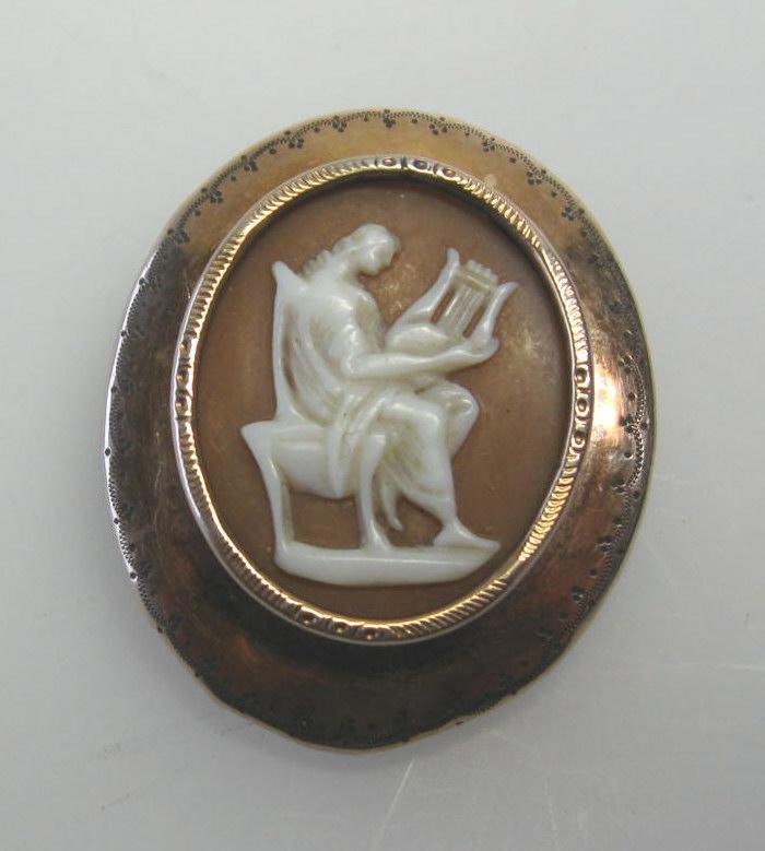 Brooch with Came, of gilded silver. Camé with woman playing af psalter in profile. H .: 3.5 cm. B .: 3.0 cm. Stamped.