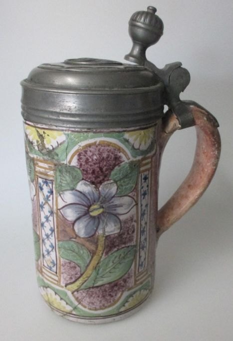 Tysk signeret fajance øl krus, 18. årh. Med tin låg.