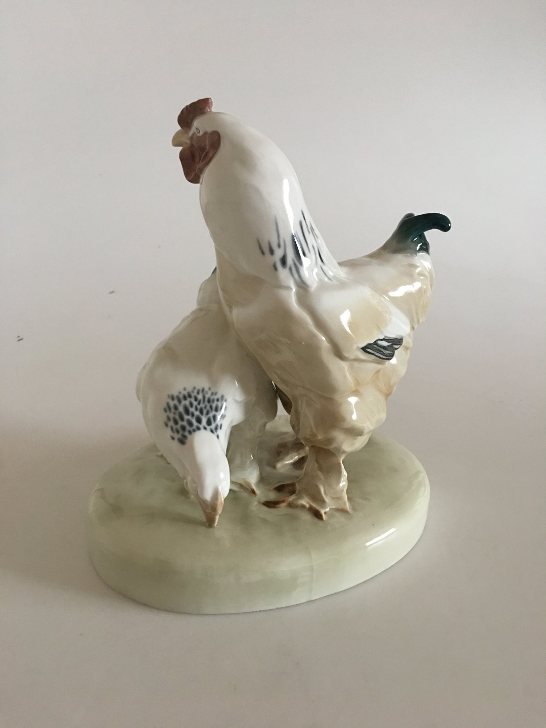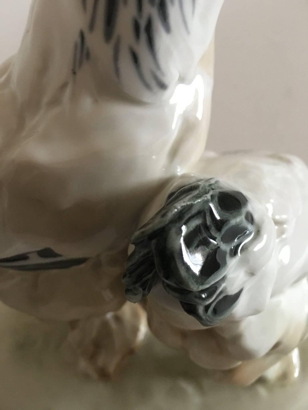 Meissen Figurine af To Kyllinger. 22 cm Høj. 18 cm Ø. I god stand. Kyllingen der græsser har en mindre reparation på halespidsen.