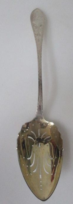 Jordbær ske i sølv, 1920, Danmark. Empire mønster. Laf forgyldt. L.: 26 cm. Vægt: 57 gram. Stemplet. Med indgravering.
