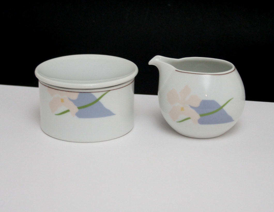 Bing & Grøndahl, Blå Orkide. Designet af Hans Christian Rasmussen. Sukkerskål med låg. Dek.nr. 302. Højde 5,5 cm. Diameter 10 cm. Flødekande. Dek.nr. 393. Højde 7 cm. Længde 9 cm. I. sortering. Pris: 425 kr. samlet. Lager: 2 sæt