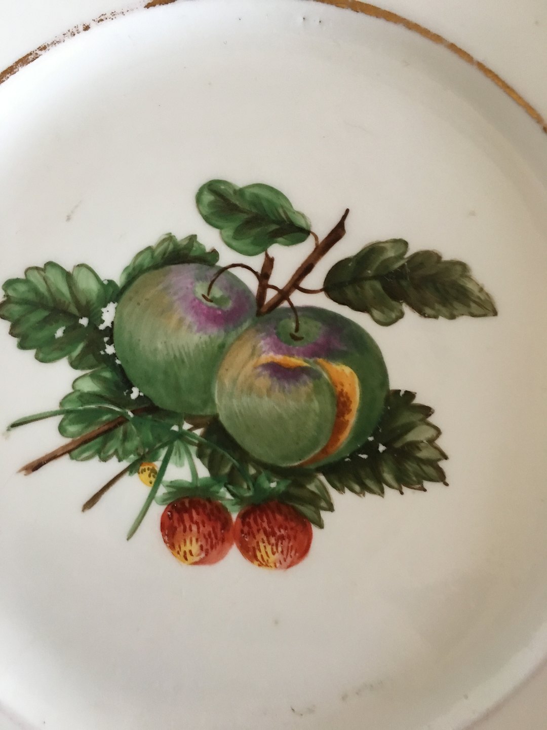 Royal Copenhagen Tallerken med Håndmalet Æble og Bær Frugtmotiv og Guldkant. 22 cm Ø. I hel stand, med noget slid på frugtmotiv og guldkant. Antik fra 1820-1850.