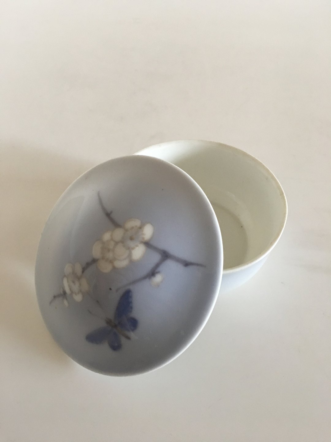 Royal Copenhagen Art Nouveau Lågskål med Blomst og Sommerfugl Motiv No 1. 4.5 cm H. 9.5 cm Ø. I pæn hel stand. 2. Sortering.