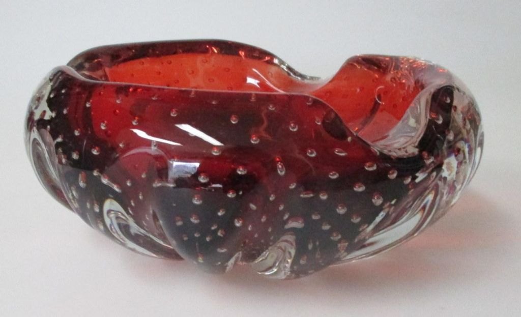 Svensk askebæger i klart glas med rødt overfang og luftbobler, 1960'erne. Højde.: 6,5 cm. Dia.: 15 cm.