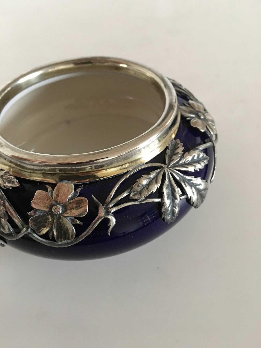 Royal Copenhagen Skål med Blomstret Art Nouveau Sølvmontering. Skålen er i pæn hel stand. Sølvmonteringen er af Anton Michelsen og har et afslag i form at et blad der røget af. Fremstår pæn. 5.5 cm Høj. 11 cm Ø