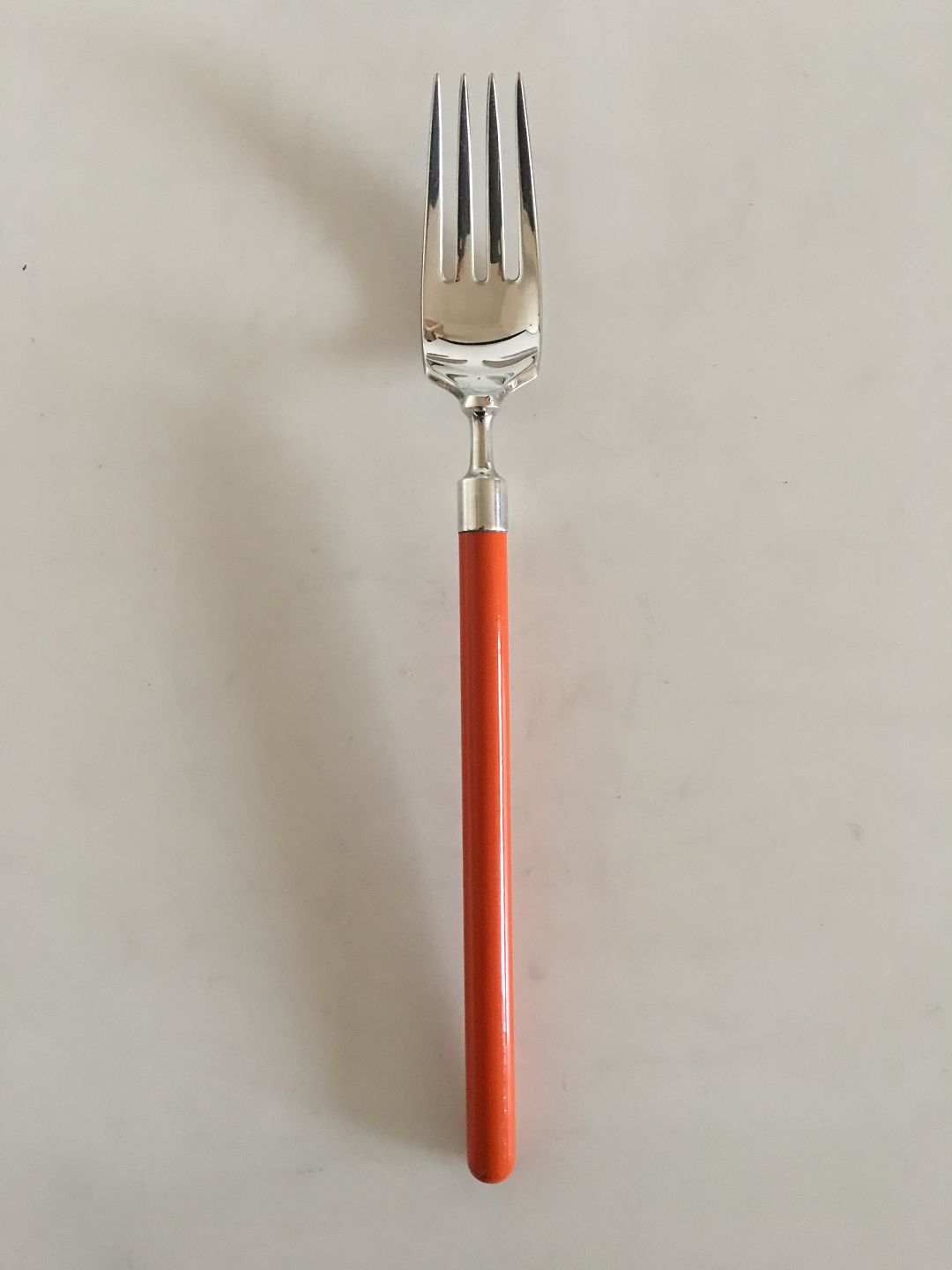 Hans Hansen Amalie Spisegaffel i Sølv med Orange Emalje Håndtag. 20 cm L.