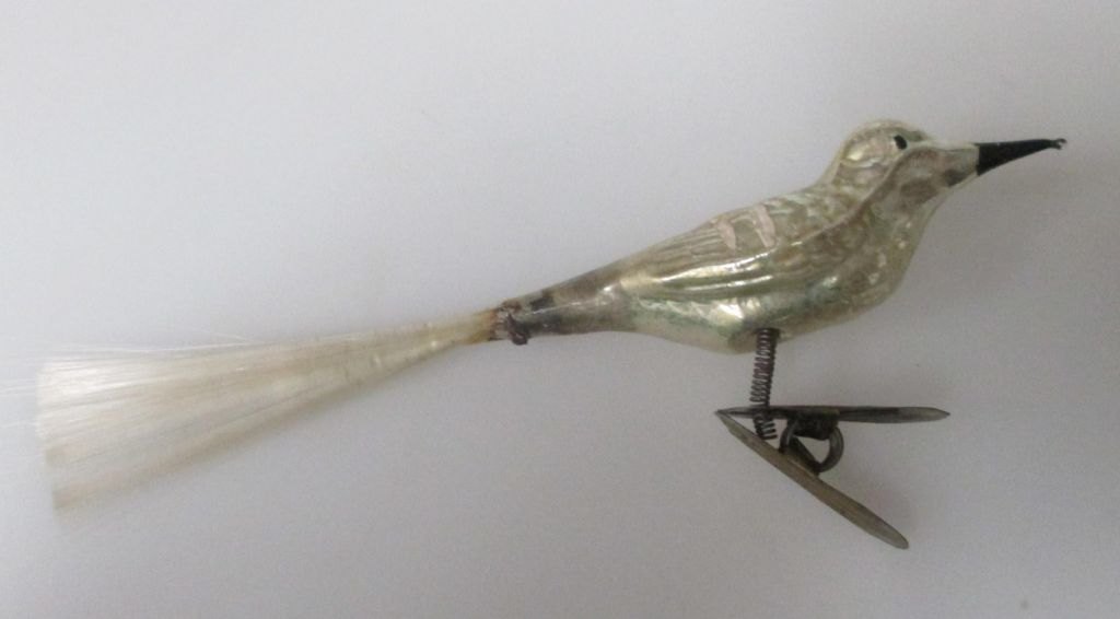 Jule træs dekoration, 19. årh. Tyskland. Emalje dekoreret glas i form af fugl. Med klemme og hale. Længde.: 14 cm.