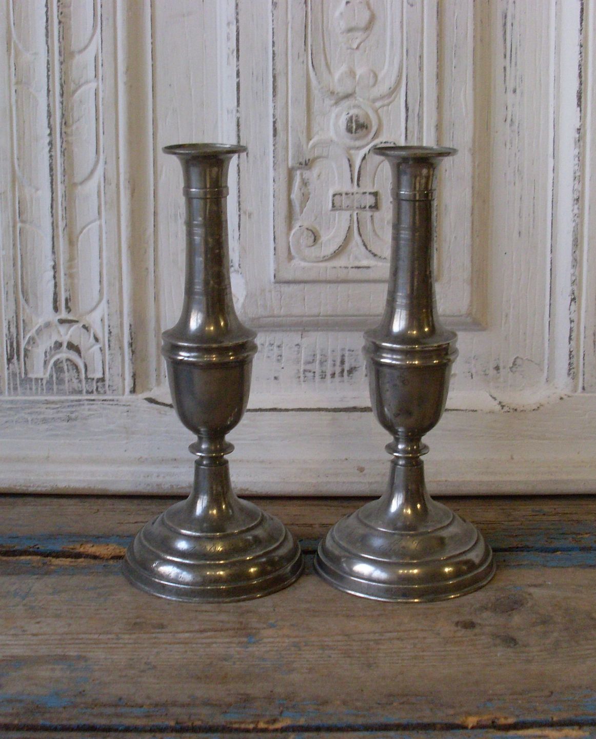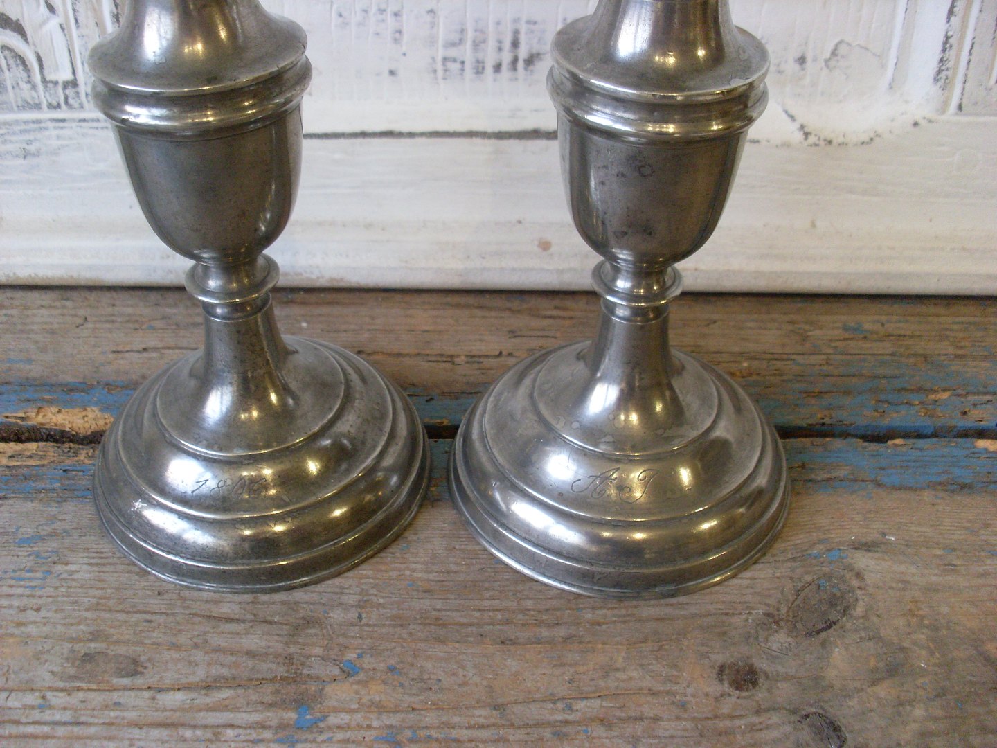 Par smukke svenske tinstager med initialer og årstal 1896.