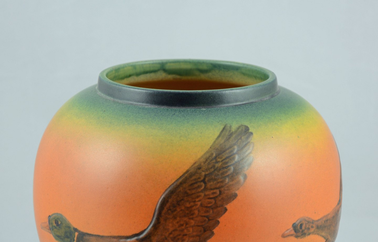 Vase i keramik fra Ipsens enke. Vasen har motiv af to flyvende ænder.