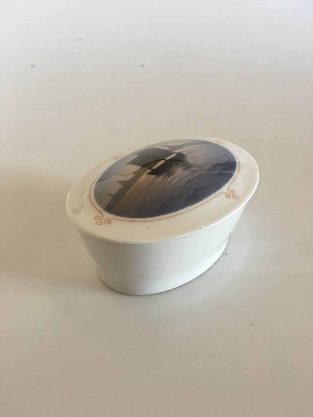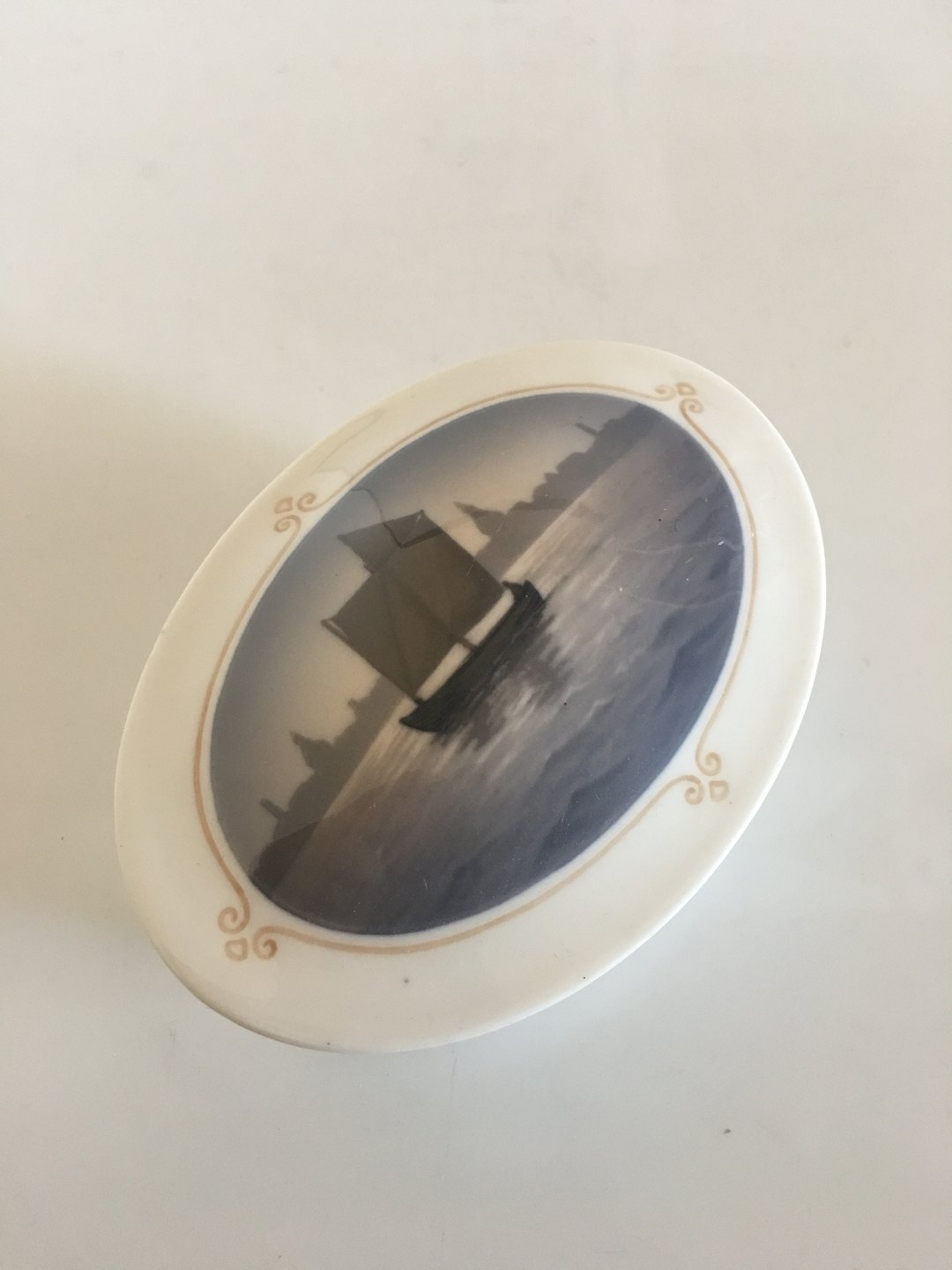 Royal Copenhagen Lidded Bowl No 1912/1756 with Harbor and Sailboat Motif. Top and Bottom does not have the same number. The bottom is No 1699. The lid is 2nd Quality. Both pieces in nice and whole condition.