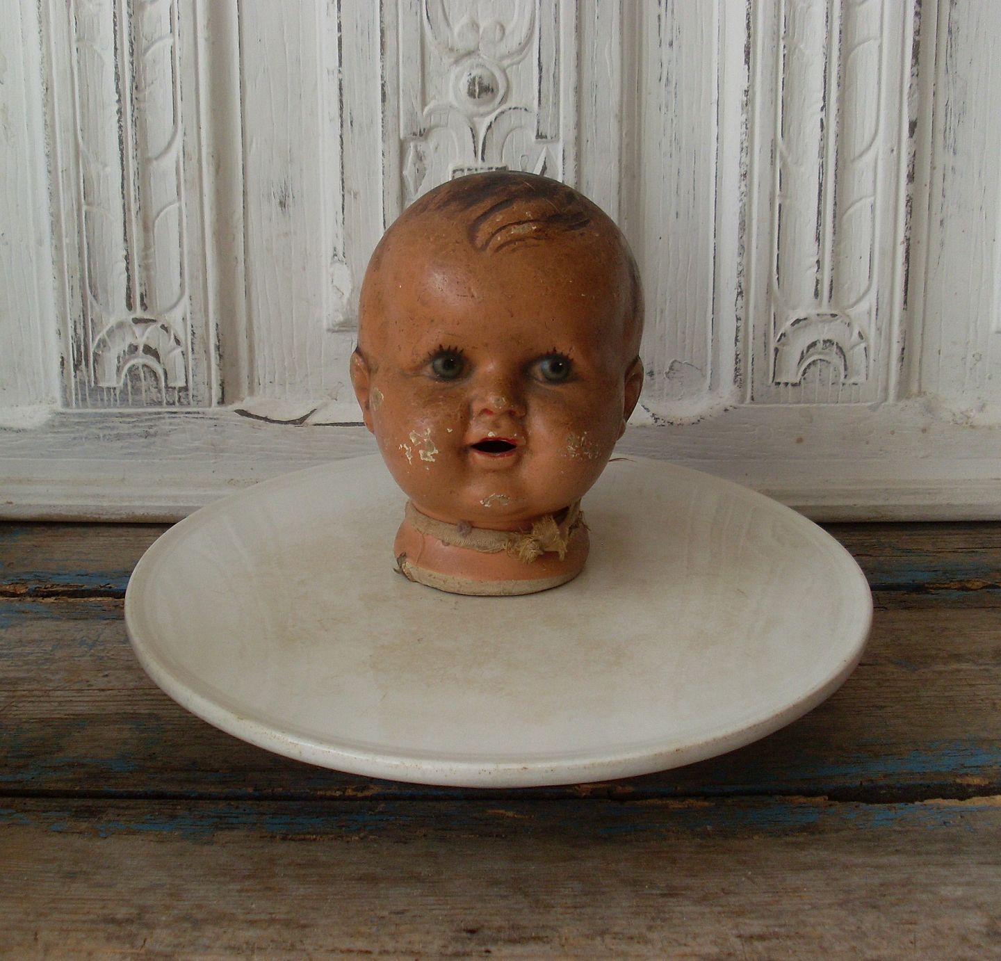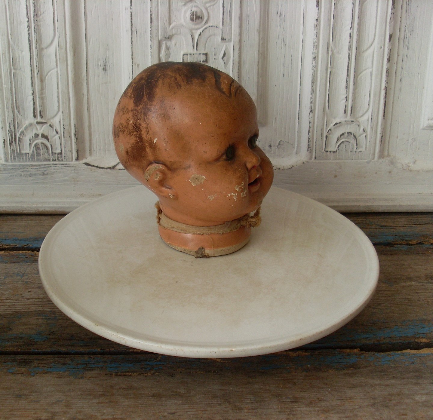 Dekorativt stort gammelt dukkehoved.