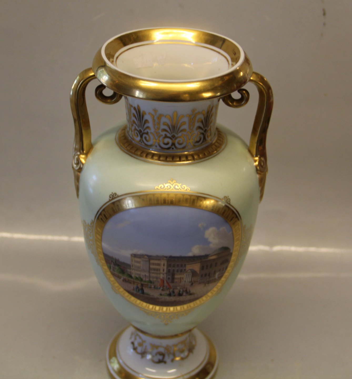 Guldaldermaleri på porcelæn: Holmens kanal - Christiansborg før branden. Christiansborgs Slotskirke Ca 1850 Kgl. fra Royal Copenhagen I hel og fin stand Empire Hankevase