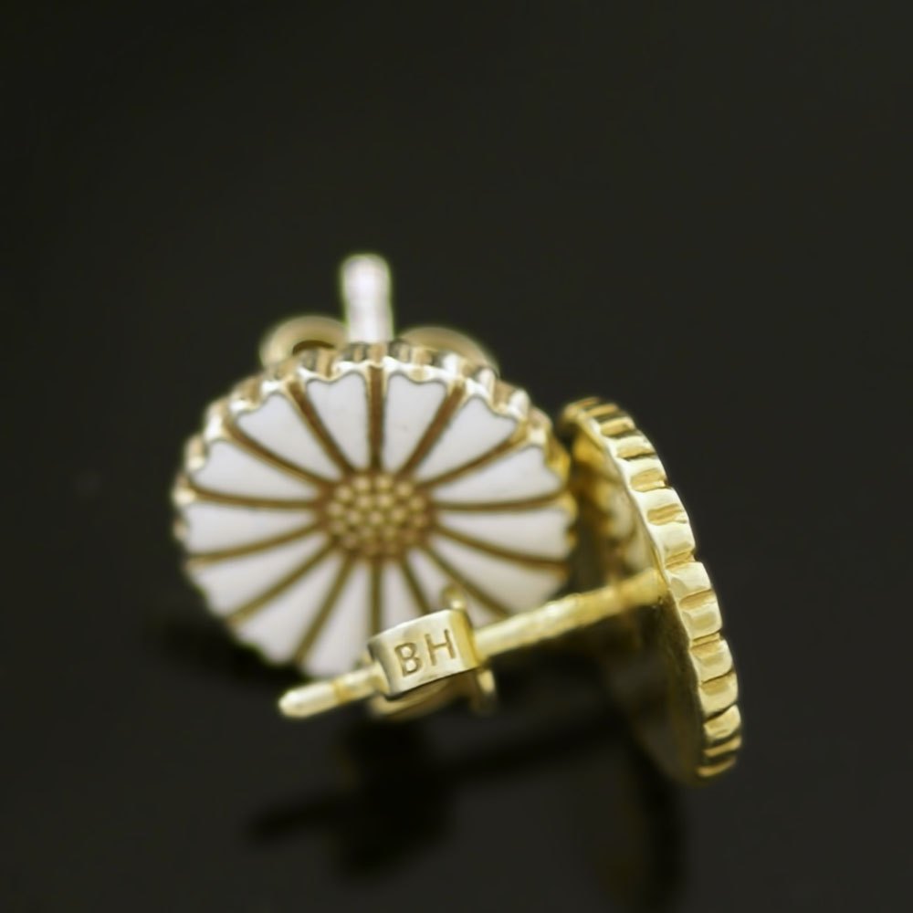 Bernhard Hertz Marguerit / Daisy. Gilded sterling silver Earrings with white Enamel. 11mm.