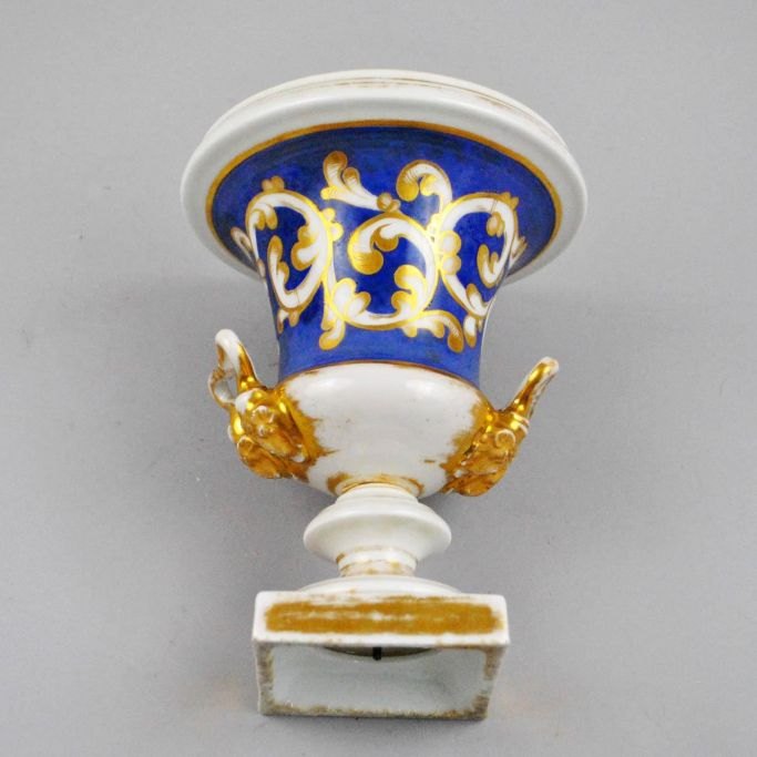 Tysk porcelænspokal, 19. årh. Hvidt porcelæn dekoreret med guld, blå bund og blomster. Håndmalet. Hanke i form af vædderhoveder. Firkantet fod. Flot stand - omend guldet er slidt. H.: 20 cm.