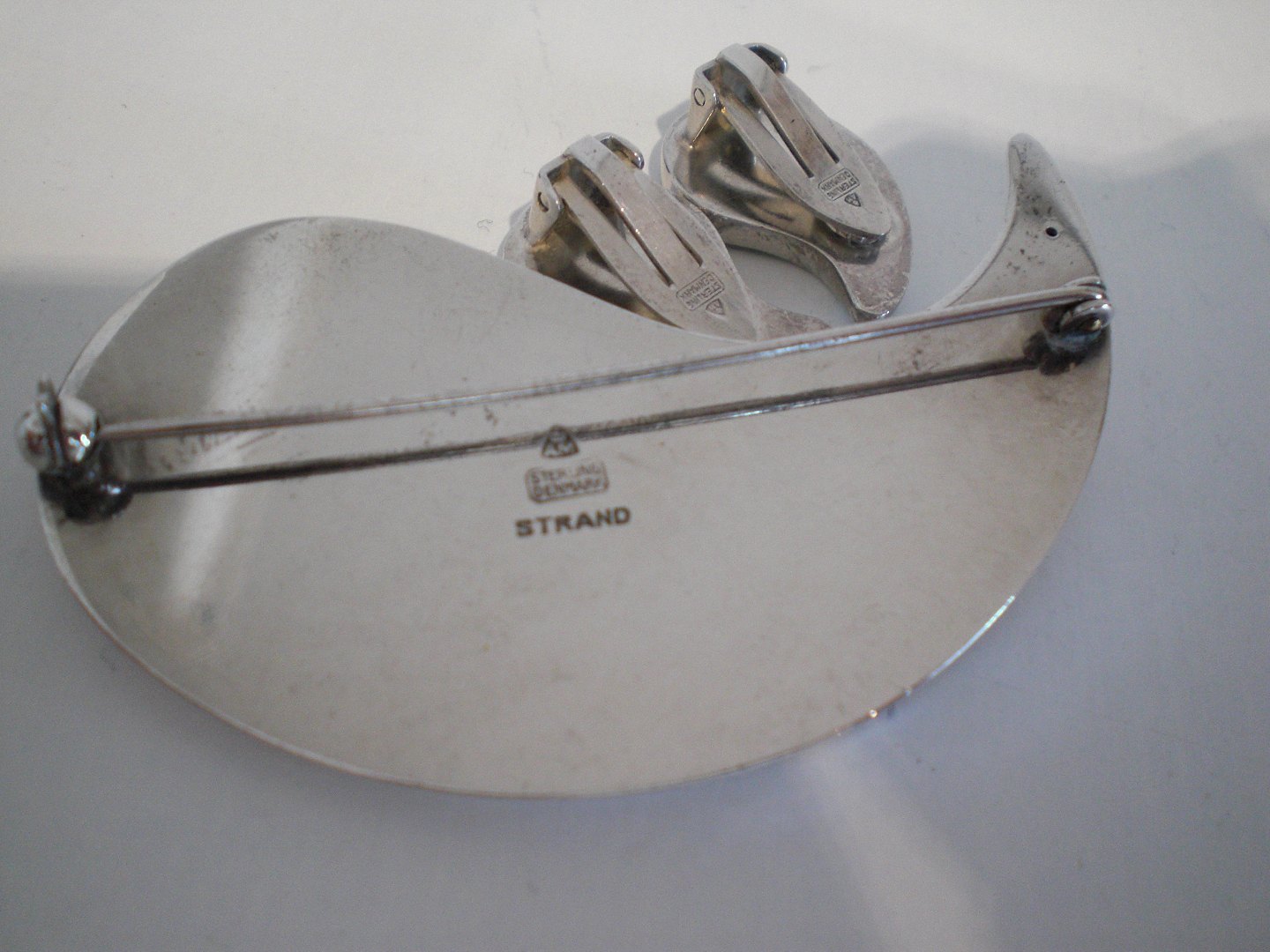 Karen Elisabeth Strand (1924 - 2000) broche og øreklips i sterling sølv udført hos Anton Michelsen ca. 1950. Samlet vægt: 34,5,4 gram. Brochens længde: Længde: 6,3 cm. - bredde: 3,4 cm. Længte øjeklips: 2,3 cm og bredde: 1,6 cm. I fin stand med megt let brugsslid. Sælges som sæt.