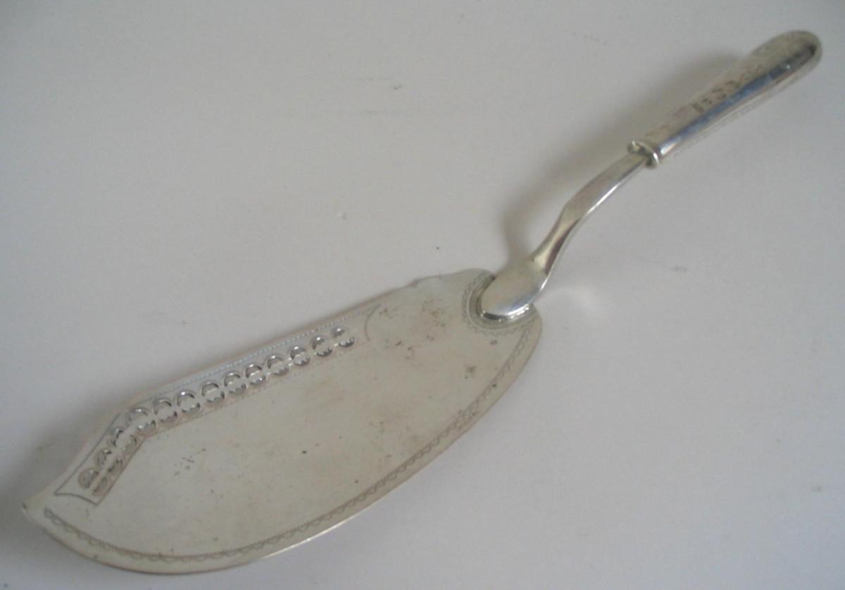 Antik dansk fiskespade, København. Empire mønster, med indgraveret monogram.: I.C.M S.M 1815. Laf med huller med dekorationer. Stemplet.: København 1815, guardeinstempel for.: Frederik Fabricius (1787-1923). Stempel fra Stenbukkens tegn. Mesterstempel svært læseligt L.: 33 cm. Vægt.: 155 gram.