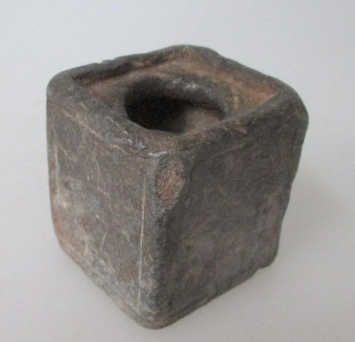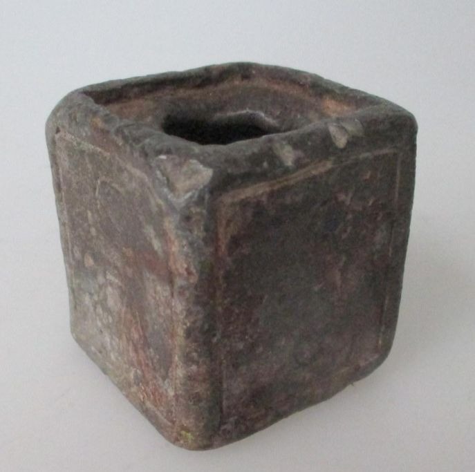 Blækhus i tin, 1677. Danmark. Med indgraveringen: NJ og 1677 på kanterne. 3,8 x 3,8 cm. Højde: 4,2 cm.