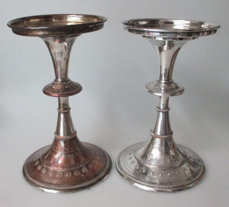 Par kirkestager, forsølvet kobber, 19. årh. Danmark.