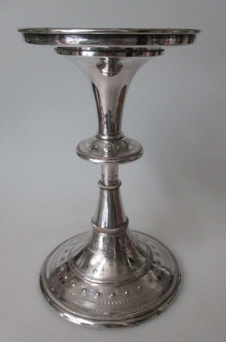 Par kirkestager, forsølvet kobber, 19. årh. Danmark. Dekoreret med geometriske mønstre. Stemplet: H. C. Drewsen, eneret. Højde.: 21,5 cm.