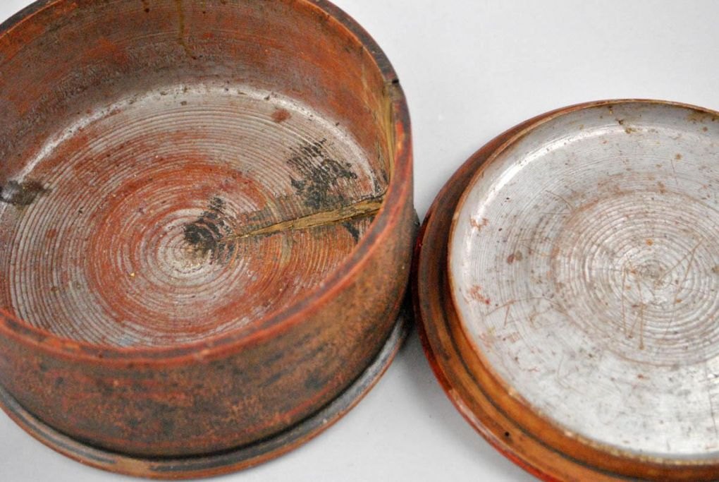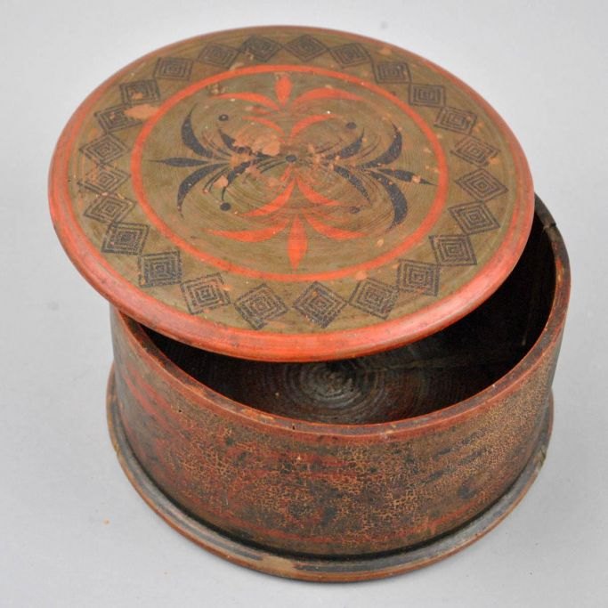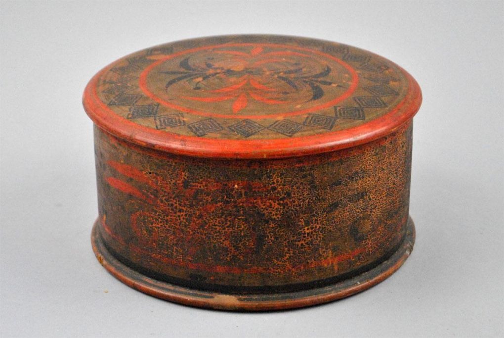 Russisk tobaks dåse af dekoreret træ. 19. årh. H: 10 , D: 19 cm.