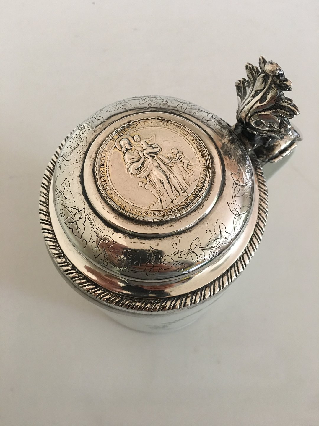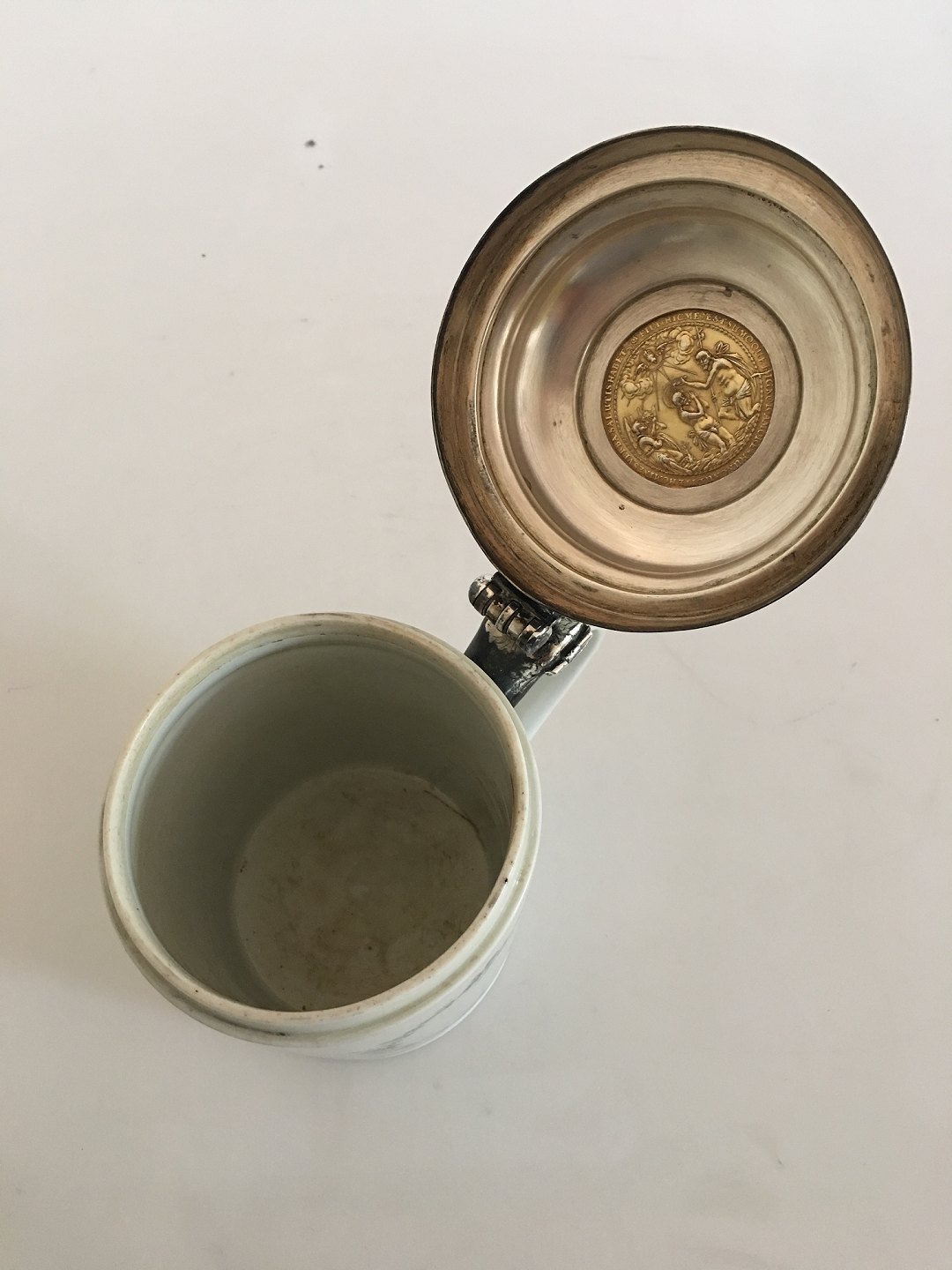 Royal Copenhagen Krus med Blomstermotiv og Sølv Låg fra 1790-1810 med Inskription fra 1880. Låget er udført af Christen Christensen Født 1830, død 1885. Borgerskab 2-5-1861. Måler ca. 18.5 cm Høj. 12 cm dia. I god stand.