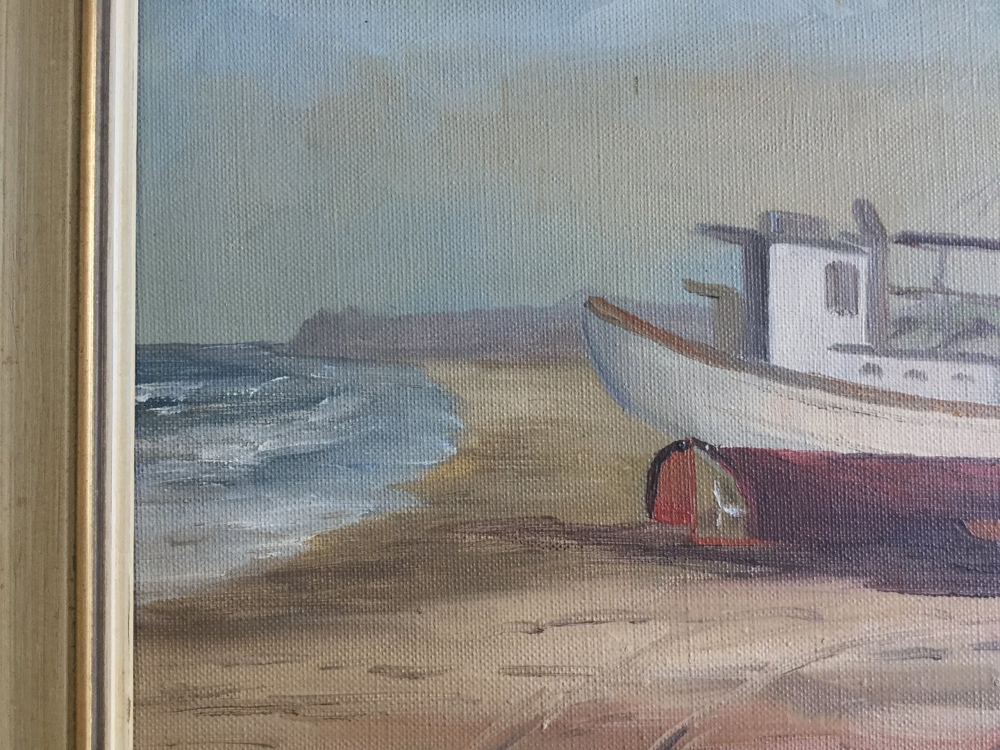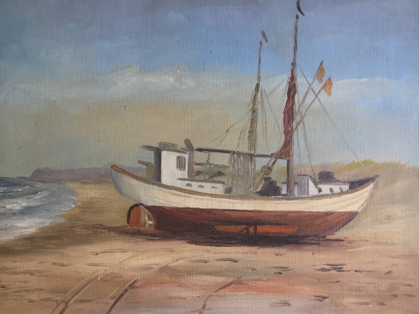 Maleri af Aage Oredsen - Fiskekutter på strand.