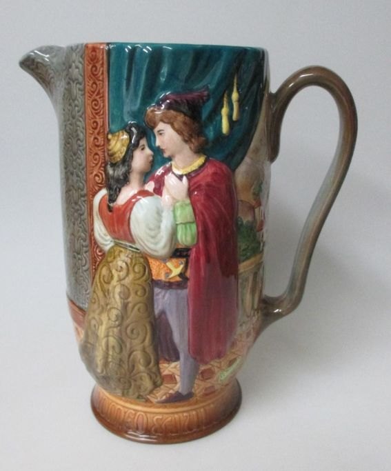 Fajance kande, Beswick, England, 20. årh. Polykrom dekoration med motiver fra Romeo & Juliet. Stemplet. 1214. Højde.: 20,4 cm.