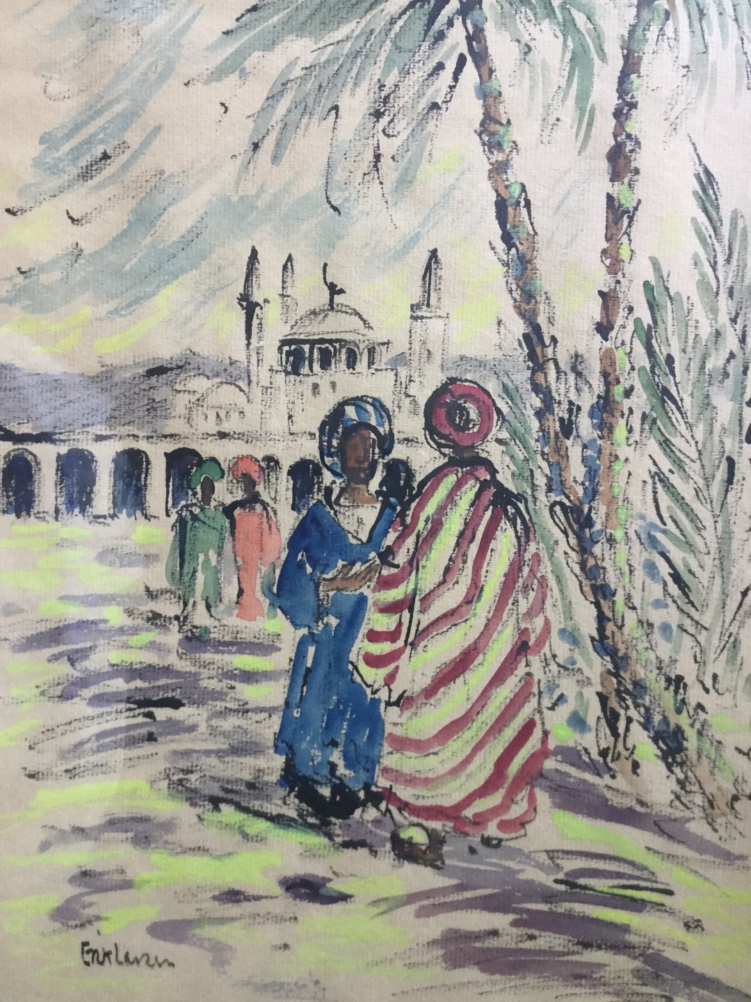 Akvarel af Erik Larsen - Sydlandsk byparti med personer.