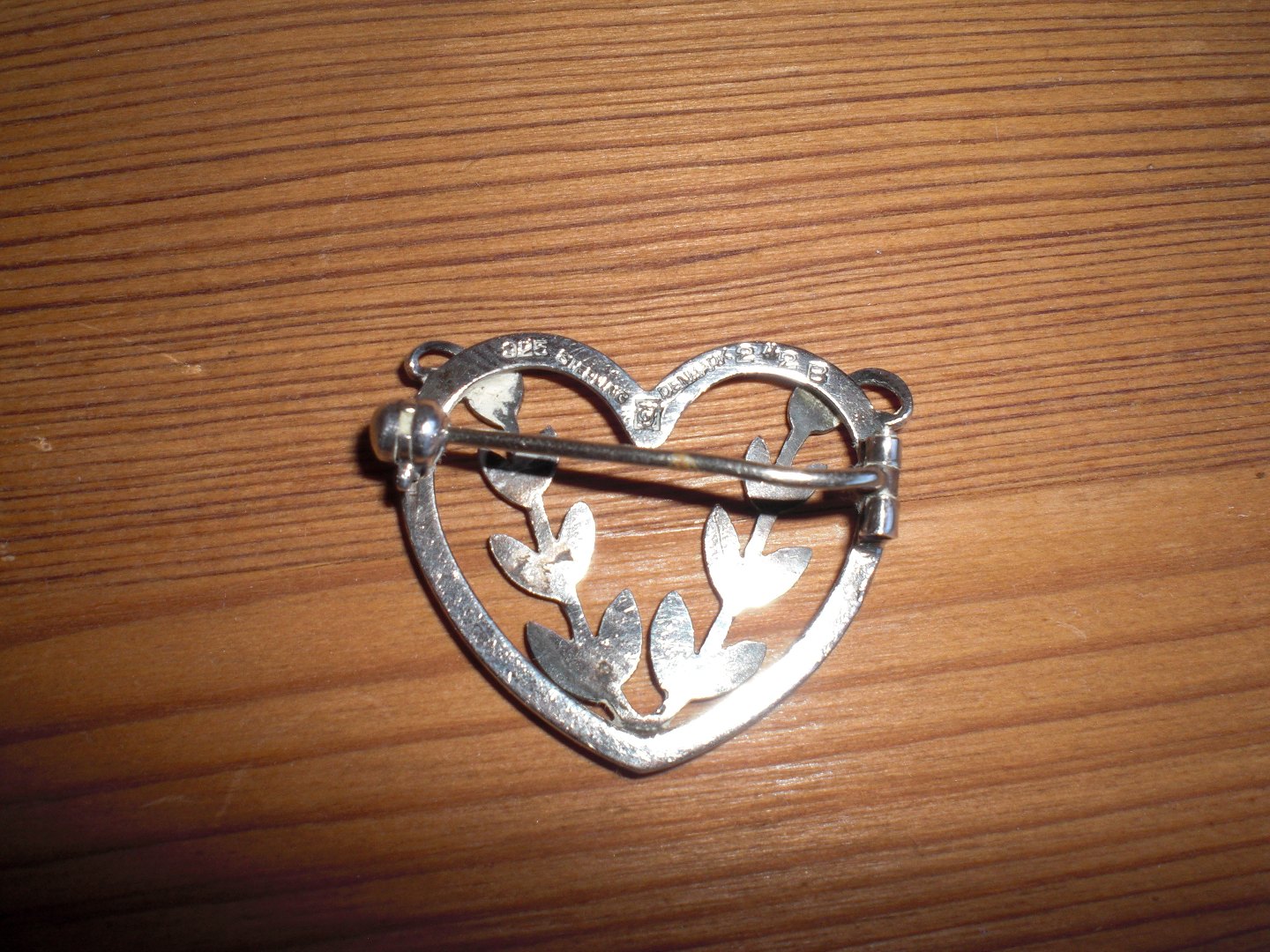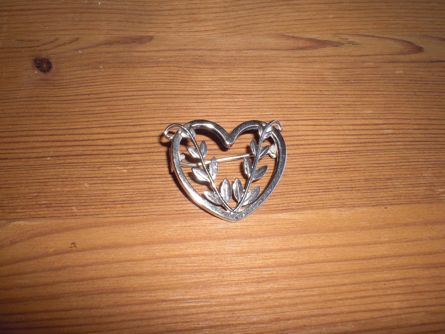 Lille Georg Jensen hjertebroche med blade i sterling sølv designet af Arno Malinowsky (1899 - 1976) i ca. 1939. Stempel GJ fra 1930 - 1945. Bredde: 3 cm. - højde: 2,5 cm.
