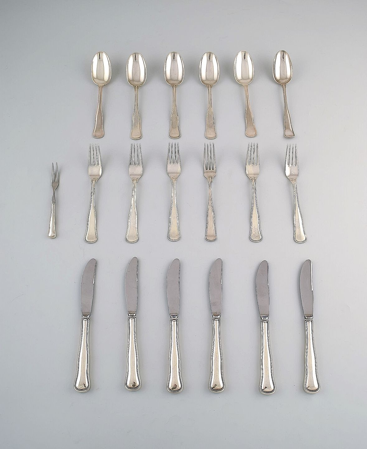 Sættet består af 6 skeer, 6 gafler, 6 knive samt en pålægsgaffel.