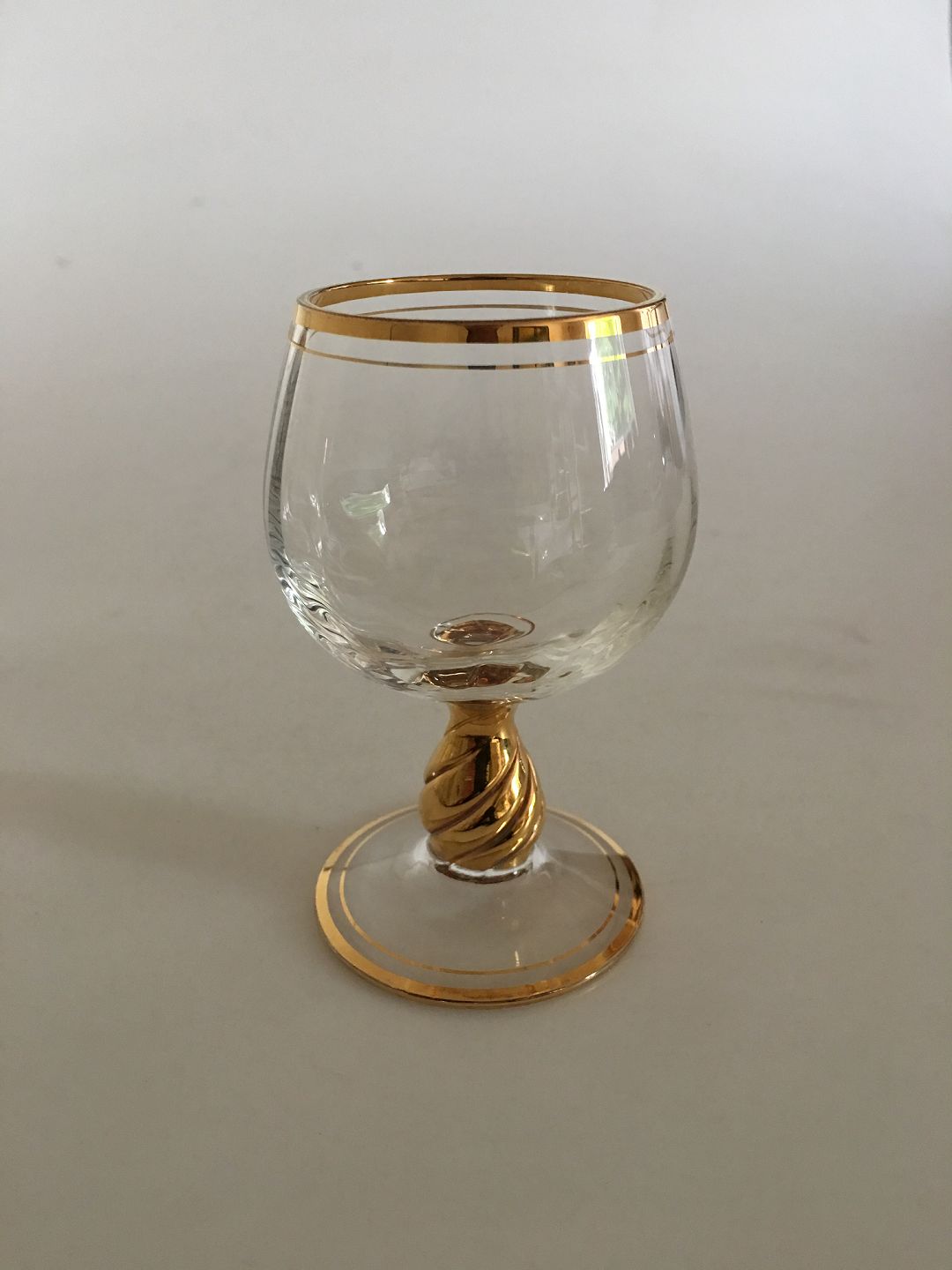 Holmegaard "Ida" cognac glas med guld på stilk, rand og fod.