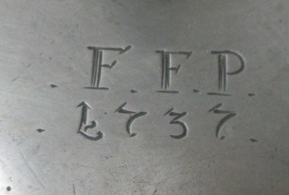 Tysk fajance krus med tin montering, 1737. Krus dekoreret i den kinesiske stil med mand i have. Låg med gæk. Mester stemplet låg med indgravering: F.F.P 1737. Højde: 23 cm.