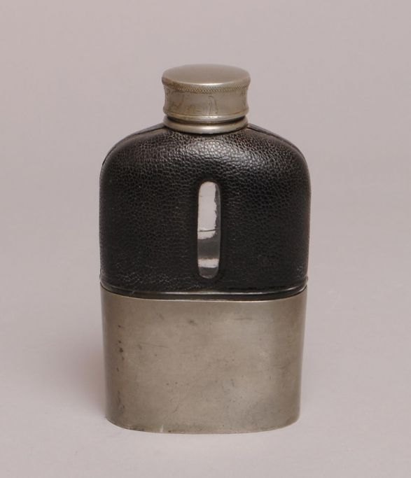 Tin lommelærke med imiteret skind. 19. årh. Mærket: Made in England, 30Z. H: 10,5 cm.