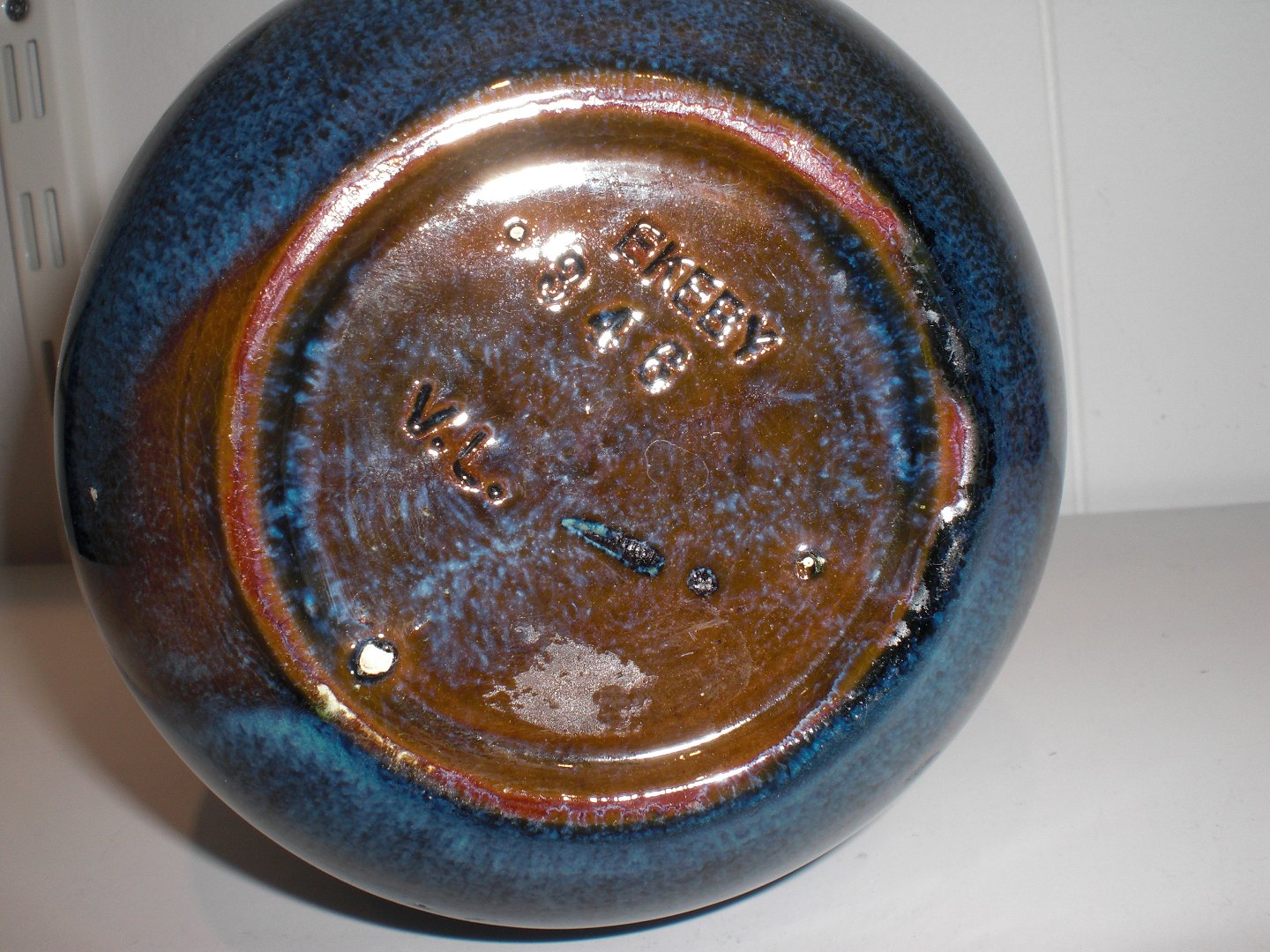 Text available in Danish: Upsala-Ekeby (1886 - ) keramikvase med smuk brun blå dobbeltglasur - stemplet Ekeby 346 - V.L. design Vicke Lindstrand (var kunsterisk leder 1942 - 1950). I perfekt stand. Højde: 20,5 cm. - bredeste diameter: 11,3 cm.