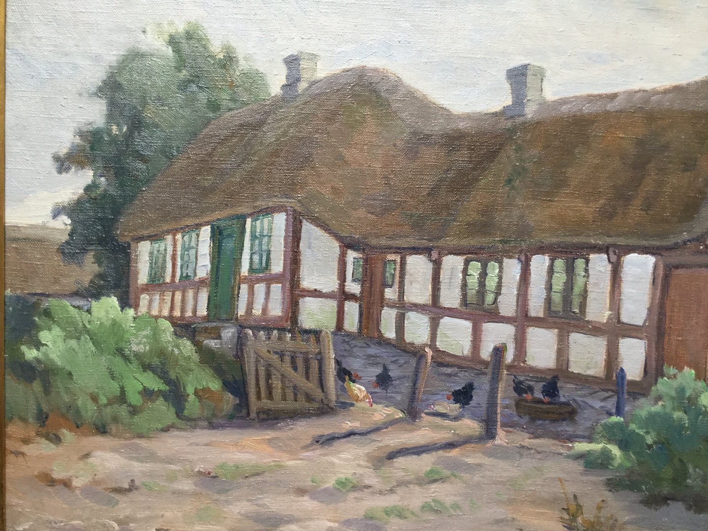 Maleri af Eiler Løndal - Høns ved bindingsværkshus..