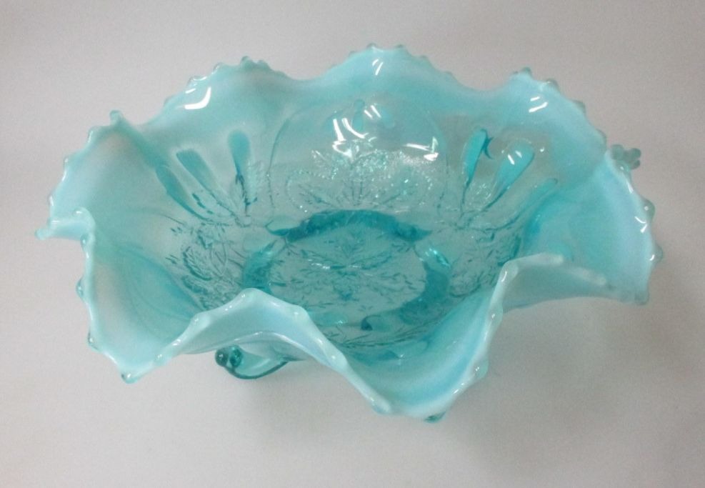 Pressed English table bowl, 19th century. Light blue glass. Decorated with leaves. Probably: Sowerby. Height: 9 cm. Dia: 22 cm.