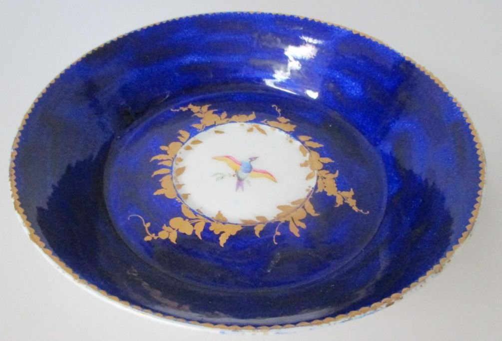 Kop med underkop, Derby, 19. årh. England. Blå dekoreret med forgyldning. Bemalinger med fugle. Stemplet. Højde.: 9,5 cm.