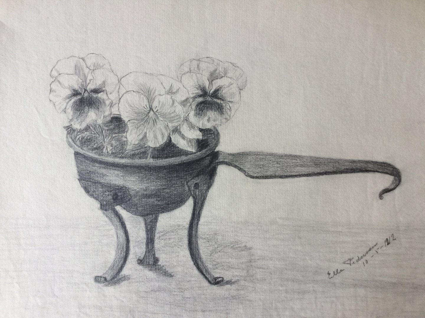Tegning af Ella Pedersen 1912 - stedmoderblomster i potte.