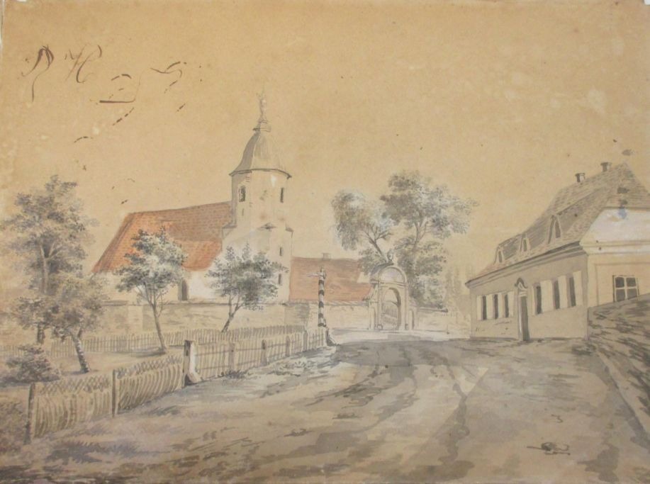 Tysk kunstner (19. årh): En kirke. Laveret tusch, akvarel og bly. 20,5 x 28 cm. Usigneret.