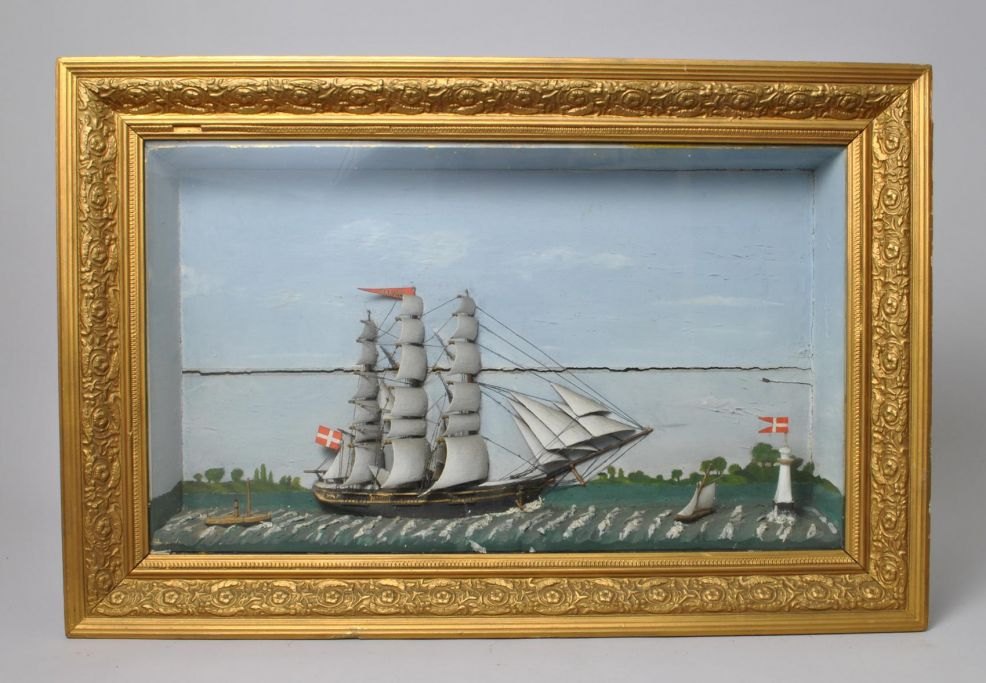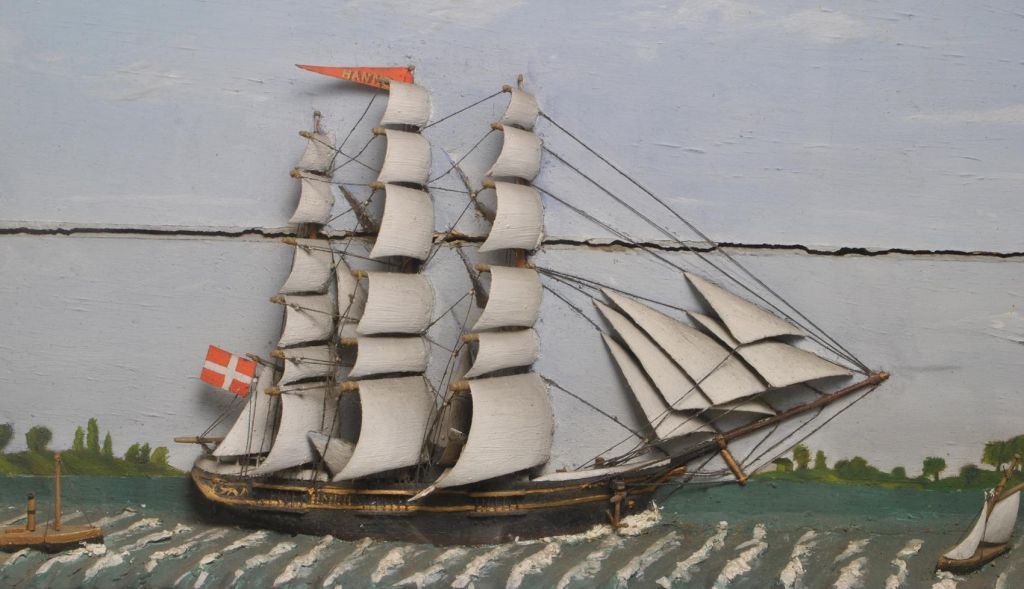 Dansk halvskib, Diorama, Hanne, tremastet fuldrigger, 19. årh. sidste halvdel. 50 x 75 cm. Fuldriggeren ses ved indsejlingen til en havn med lods.